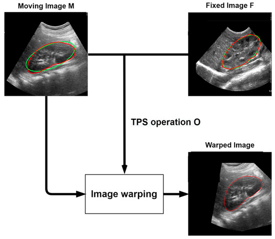 First, the kidney boundary of the ground truth image of the moving image M and the fixed image F is modeled and approximated as an ellipse. It is then identified as the feature points of the four vertices of the ellipse of the moving image M and the fixed image F. Then, the TPS operation is obtained by registering the feature points of the moving image M to the feature points of the fixed image F. The landmarks of the moving image M and the fixed image F are represented by and , respectively. TPS operation is defined as follows: