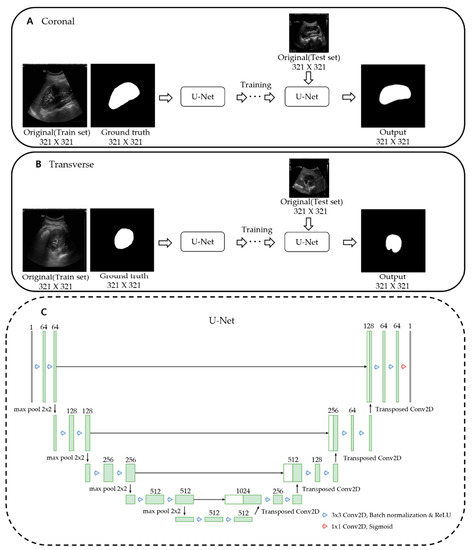 The number of data was sparse in this study because obtaining the proper image data, especially from children, is difficult in a retrospective study. Therefore, we trained the U-Net model separately on the coronal and transverse sections to maximize the efficiency of the training. The outline of the transverse section is more complex than that of the coronal because of the region where the ureter emerges from the hilum. Our data show that the coronal section performed better than the transverse section because there were more conditions to be considered during the training for the segmentation of the transverse section. In consideration of the distinct differences of features between the coronal and transverse sections and the small number of data, we thought that the separate training of each section of the kidney was adequate for our study.