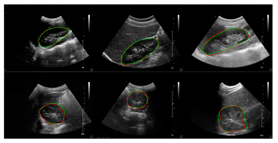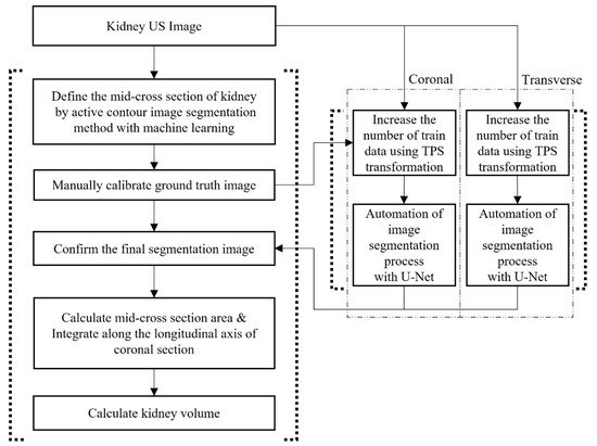 The kidney’s cross-sectional area, according to the contrast gradient in a US image, can be extracted using active contour image segmentation by machine learning. Since the contrast gradient is often unclear along the kidney borders due to the characteristics of US images, the border should be determined through manual calibration. Thus, we applied hybrid learning to automate the image segmentation process, which combines machine learning and deep learning to maximize the function of the conventional machine and deep learning [26,35,36].