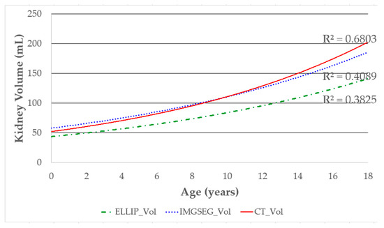 Correlation between age and kidney volume according to volume measurement methods. The R2 values are shown to compare the correlation between age and kidney volume obtained by each volume measurement method. Higher R2 values indicate a stronger correlation.