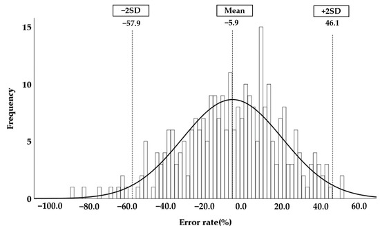 Normal distribution of the error rate. The error rate was calculated according to Equation (12). The mean error rate and ± double standard deviation (2SD) are plotted on the normal distribution graph.