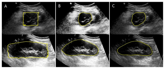 Before the manual calibration, only the square-shaped regions of interest were determined, and the results show inaccurate kidney boundaries (Figure 9A). Therefore, manual calibration with accurate kidney boundaries was performed to obtain the ground truth images (Figure 9B). The kidney boundaries were automatically extracted with the proposed hybrid learning method using segmented kidney US images from U-Net as an initial mask for the active contour processing (Figure 9C).