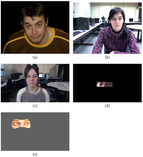 MPIIGaze [56] contains 213,659 images collected from 15 participants during natural everyday laptop use over more than three months. This is one of the largest and most varied and challenging datasets in the field. However, some images include the whole face while others do only contain a cropped version of the eye area. Labels for the eyelids are provided in the image together with some 3D information, such as estimated head pose and gaze direction with respect to the camera. The authors claim that a subset containing 10,848 images has been manually annotated including eye corners, pupil centers, and specific facial landmarks. These manually annotated images present acceptable accuracies regarding pupil center and eye corners for several applications, but they cannot be considered suitable for the eye landmark detection task. In order to compensate for this fact and be able to work in more accurate conditions, in [64] a manual re-labeled procedure was done following the same guidelines as the I2Head database. In total, 39 images per user were selected among the 15 subjects included in the original annotation set, resulting in a total of 585 manually annotated images. In Figure 2d, a sample from MPIIGaze database is shown.
