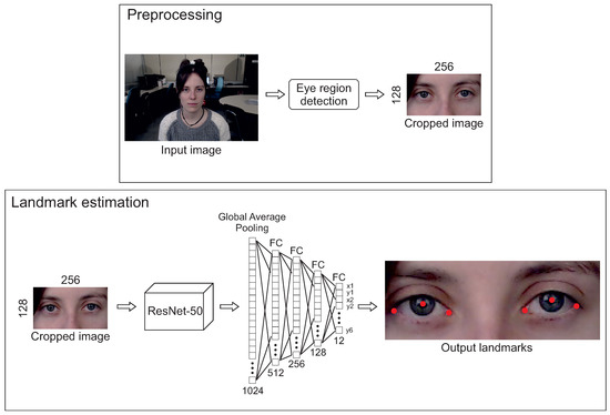 Method proposed. Top: preprocessing step in which the eye region is detected and the image [20] is cropped and resized to a resolution of 128 × 256. Bottom: eye landmark estimation method proposed. The backbone consists of a Resnet-50 followed by a fully connected regression network to obtain the eye landmarks detection.