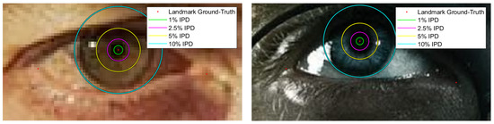 where and are the euclidean distances between ground-truth and estimated left and right pupil centers, and is the inter-pupillary distance in Equation (2). The maximum of and after normalization is defined as maximum normalized error . The accuracy is calculated as the percentage of images for which this error is below specific thresholds. State-of-the-art methods are usually compared using , and although some of them do not provide results for accuracy below 5%. Another interesting way to do a performance analysis of the proposed methods that is usually shown in papers, is the cumulative error histogram, which represents the accuracy continuously, i.e., it shows the proportion of images with an error less than each percentage value of IPD. In Figure 4 different distances from ground-truth labels can be shown as percentages values of the inter-pupillary distance, green circle represents a distance equivalent to 1% of IPD, while magenta, yellow and cyan represent the 2.5%, 5%, and 10% of the IPD, respectively. It can be observed that a 10% of the IPD is equivalent to the iris size and a value between 2% and 5% is comparable with the pupil size (depending on the constriction of the pupil).