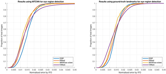 To show the results in a more visual way and to enable future works to obtain accuracies for different thresholds, Figure 5 shows the cumulative error histogram using our method in the aforementioned databases. Comparing the results of initializing the pupil center detection using the MTCNN face detector (left) and the ground-truth landmarks (right), it can be seen the robustness of our method against initializations.