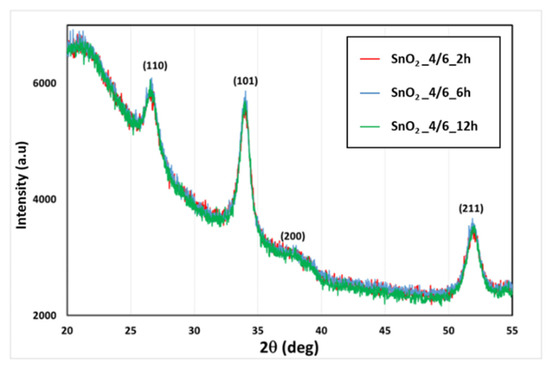 Figure 4 depicts the X-ray diffraction patterns recorded from the three obtained samples. As we can observe, all the spectra showed the same peaks at 26.59° (110); 33.88° (101); 37.96° (200); and 51.79° (211). This was indicative of a tetragonal rutile phase of SnO2 with the mesh constants of a = b = 4.7370 A° and c = 3.18 A° (JCPDS N° 72–1147), with the preferred orientation at (101) and (110). Using the XRD analysis results, we noted that the structure of all the samples did not change with respect to the annealing time and that there were no significant changes in the recorded spectra.