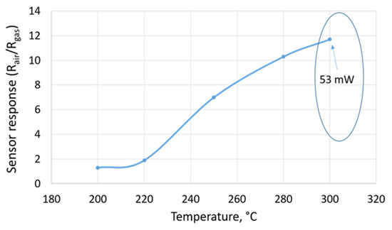 The optimal working temperature is an important parameter to be determined for a gas sensing application. Indeed, it has a direct influence on the adsorption ability, catalytic activity, sensitivity, and response and recovery times [36]. Figure 8 displayed the behavior of the sensor as a function of a heater temperature in the presence of 50 ppm of ethanol. Overall, by increasing the temperature, the sensor response was increased, which means that the rate of adsorption was accelerated and the activation barrier was lowered. Furthermore, all the measurements were carried out at 300 °C, which corresponds to 53 mW, with an applied voltage of 2.1 V, in order to avoid the breaking of the membrane. This temperature value was considered to be the optimal working temperature for our sensors.