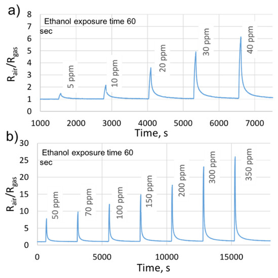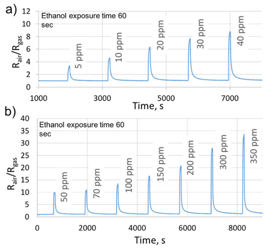 The gas sensor responses for (a) low and (b) high ethanol concentrations, under dry air, at the sensor’s optimal working temperature.