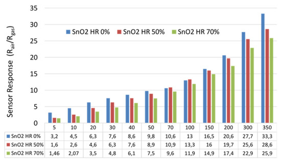 Figure 11 represents a summary of the sensor responses to all the studied ethanol concentrations in dry and humid atmospheres. We can observe that the effect of humidity on the sensor’s performance was low. The SnO2 fabricated sensor shows a good immunity against high levels of relative humidity, which makes it an excellent candidate for our real application.