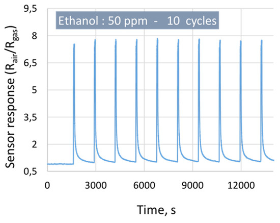 Figure 12 shows the repeatability of the sensor response to 50 ppm of ethanol with 70% of RH, using 10 cycles of measurements at 300 °C.
