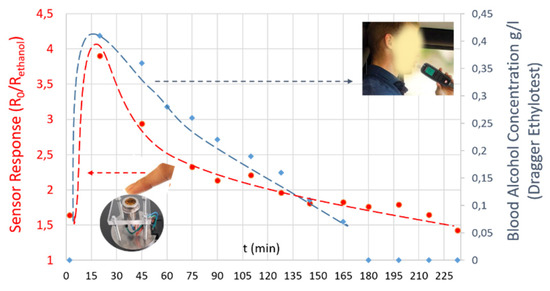 Figure 14 displays a comparative study between alcohol transdermal detection, using SnO2 gas sensors, and blood alcohol content, using a certified DRAGER 6820 breathalyzer. Following the ingestion of the tequila, the blood and transdermal tests show a rapid increase in blood alcohol levels and sensor responses, respectively. The time necessary to observe the alcohol level of 0.0 g/L in the blood was 3 h. In contrast, we noticed that the sensor was still detecting alcohol from the skin even after 4 h. Indeed, this slow kinetics of ethanol removal from the skin has already been mentioned in the literature [12]. Hence, there is a clear conformity between the obtained results, which validate our embedded transdermal detector device based on the SnO2 MEMS gas sensors.