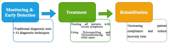 To address key challenges related to COVID-19, the tech industry is increasingly seeking for repurposing technologies that have been used recently such as ubiquitous connectivity and big data to suit the needs of COVID-19–related healthcare services. Advances in the IoT (Internet of things), AI (Artificial intelligence) and cloud computing together offer an unprecedented opportunity to improve healthcare systems [5], thereby minimizing harmful effects on human health and saving countless lives. However, given the severity of COVID-19, putting that bold promise to the test, China, where the virus was first detected in late 2019, has effectively integrated technology in the governments’ health response systems to not only combat the ongoing outbreak of coronavirus but also guarantee the continuation of normal daily life. Managing the pandemic for reducing its impact and continuation of normal daily life requires an effective response. In addition, for reinforcing the prevention and control measures, specific actions must be undertaken in three main phases: monitoring and early detection, treatment, and rehabilitation phase, as illustrated in Figure 1.