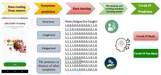 Data from the self-reported questionnaire and embedded sensors are sent to the fog node, where it is preprocessed and aggregated into three features: symptoms, age, and comorbidity. The model designed in this study is constructed as a set of layers. Figure 2 provides an overview of the proposed framework illustrating its components of data reading, symptoms prediction, and developing and training machine learning models. Data reading from sensors involves scanning temperature sensor measurements during fingerprint touching on the smartphone screen, recording sound measurements from the microphone during a series of cough, obtaining the accelerometer sensor measurements during 30-s sit-to-stand to analyze fatigue, and finally getting information about other symptoms that are pretty much restricted to yes or no answers. Symptoms prediction uses readings taken from smartphone sensors and provides the calculated symptoms level separately, and then store as a record input to the next layer. For symptoms collection, a smartphone app is designed with a series of screens, as shown in Figure 3.