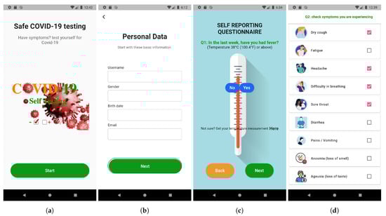 Snapshots of the app designed for data collection and prediction, (a) initial screen; (b) particulars screen; (c) temperature reporting; and (d) symptoms screen.