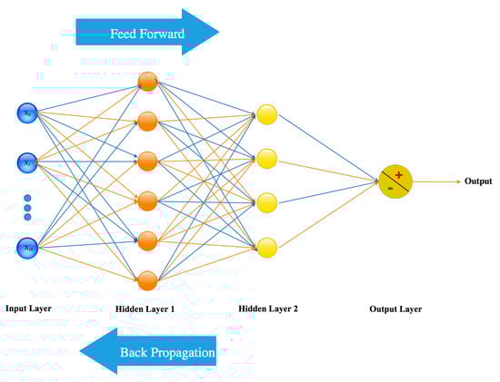 Several classification algorithms such as SVM (Support Vector Machine), RF (Random Forest), feed-forward ANN, LR (Logistic Regression), DT (Decision Tree), and K-NN (K-Nearest Neighbors) have been trained and tested to analyze their performance to find the highest numerical results. The ANN classifier has been selected as it is balanced in terms of accuracy, sensitivity, and F1-score. The architecture of the used ANN in this study is given in Figure 6. This architecture includes 19 inputs to , 6 hidden neurons in the first hidden layer, 4 hidden neurons in the second hidden layer, and 1 output neuron.