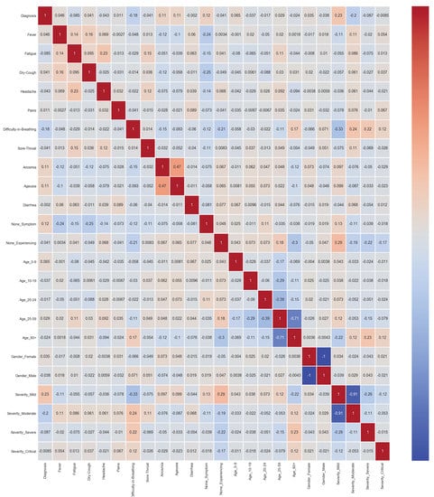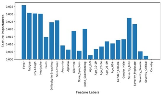 A decision tree-based feature weighting has been carried out to determine the importance of the features for COVID-19 diagnosis. Feature importance with respect to its correlation to the target class is shown in Figure 8. It shows that ‘country’, ‘severity_critical’, and ‘age_o-9’ are the features with the least importance to diagnose COVID-19. Consequently, five of the twenty four features have been dropped. Based on feature importance analysis and literature findings [1,42], the 19 features used in this study are the main factors influencing the severity levels of COVID-19. A correlation plot for all 24 features has also been added, as shown in Figure 9.