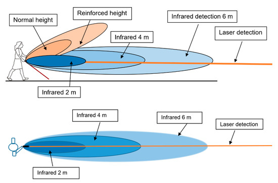 The user can choose between 2, 4 and 6 m detection ranges. Here, the laser and infrared detection are both limited to the same value—2, 4 or 6 m. If the user chooses the 12 m detection range, the laser can achieve 12 m detection, but the infrared detection range remains limited to 6 m.