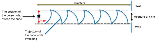 We used the following process to check whether or not the cane can be used to detect under standard walk conditions at different distances. We fixed the distance d (6 m for example), while the width of the cane tip’s sweep (50 cm for example) was limited by parallel bars on the floor (Figure 3). We used a metronome to determine the cane’s sweep at a set step cadence (1.66 Hz for example). For a thin obstacle, if the user felt a vibration in the direction of the obstacle at the given sweeping rate, the obstacle was considered as detected by the sensors. For an aperture, if the user felt no vibration in the direction of the aperture at the given sweeping rate, it was considered detected.