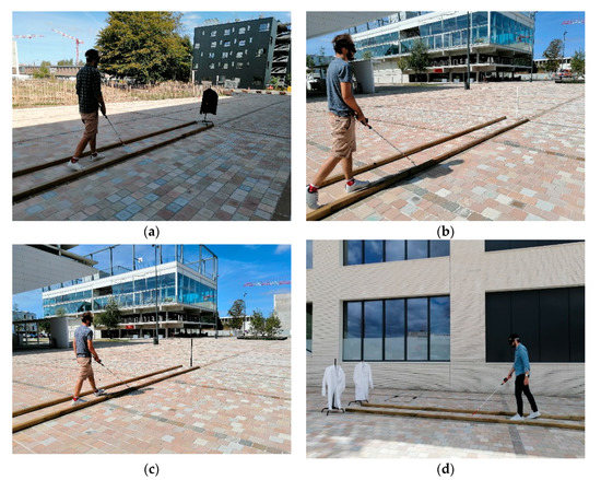 A sighted blindfolded participant sweeping the cane between the two bars at a given cadence to detect (a) a large dark obstacle under intermediate luminosity conditions; (b) a white thin post in full sunlight; (c) a dark thin post in full sunlight and (d) an aperture.