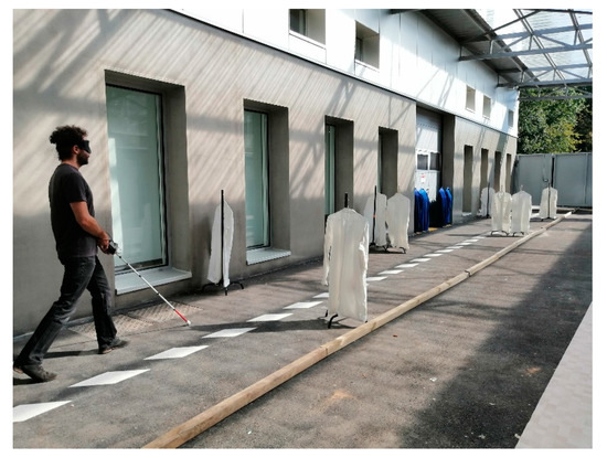 The test path was 25 m long and 2.4 m wide, with a wall on one side. On the other side, 7 cm square wooden bars limited the width of the path. This configuration was intended to reproduce a sidewalk. The obstacles were coat racks, 60 cm wide and 1.2 m high, used to simulate the presence of a person or a trash can on the path (Figure 4).