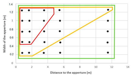Detection performance for apertures, with black points representing points of measurement from different distances. The red parallelepiped contains points indicating apertures detected at 0.8 rad/s; those inside the yellow parallelepiped indicate apertures detected at 0.4 rad/s and the green parallelepiped indicates full aperture detection at 0.2 rad/s.