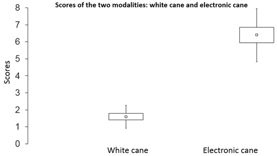 The mean scores of the blind participants in the mobility test are provided in Figure 7. For a simple white cane, the average score was 1.6 (standard deviation = 0.67; standard error = 0.19), whereas with the Tom Pouce III, the average score was 6.4 (SD = 1.56; SE = 0.45).