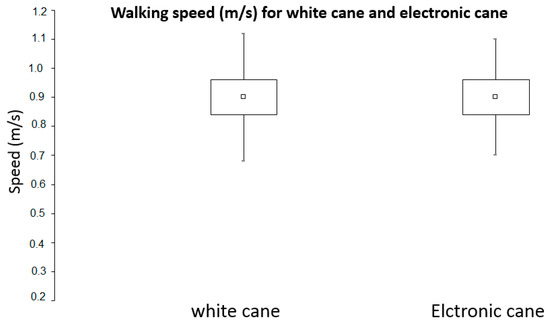 The Student paired t tests for comparing mean sores between the white cane and the Tom Pouce III (Figure 7) indicated significantly greater scores when using the Tom Pouce III (t(11) = 10.12, p = 0.00000066). The mean walking speed of participants in m/s is reported in Figure 8. The average speed of the 12 participants was 0.9 m/s when using the simple cane, and the speeds when using the electronic cane (with, respectively, SD = 0.22 and 0.2, and SE = 0.06 and 0.06) were very similar under both modalities. There was no significant difference in mean walking speed as a function of the cane, (t(11) = 1.32, p = 0.21), suggesting that the difference in score cannot be attributed to a difference in walking speed. In other words, there was no speed–accuracy tradeoff in our data.