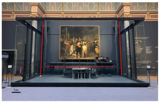The Night Watch surrounded by the glass chamber in the Gallery of honor of the Rijksmuseum. The red vertical lines highlight the two y axes of the imaging frame, and a red-dot horizontal line highlights the x-beam to which the instrument platform is anchored.