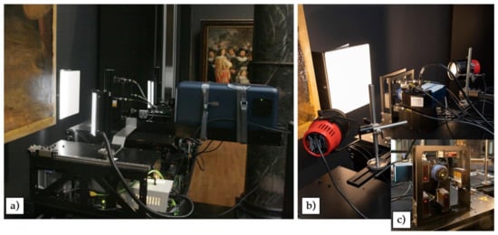 The VNIR hyperspectral camera (Surface Optics Corp., San Diego, CA, US—710E model) utilizes a grism imaging spectrometer combined with a backside illuminated EMCCD (Princeton Instruments) which provides 1024 spatial pixels along the slit. It is equipped with a LM50HC-IR lens by KOWA with an EFL of 50 mm. The spectral range of the camera is 400 to 1000 nm and a spectral resolution of 2.54 nm, with a total of 256 spectral channels, and operates at an F-number of 2.8. With the working distance of 70 cm, the spatial resolution at the painting was 0.168 mm, resulting in a vertical field of view of 172.03 mm and a depth of focus of ±2 mm. The integration time set on the camera was 200 ms per spatial line, and the scan speed used was 0.672 mm/s (Table 1). The illumination is provided by two 20 cm line lights with cylindrical lenses (Schott fiber optic line light) set up at 50 degrees from the painting normal and at a distance of 40 cm from the painting surface (Figure 2a). The fiber bundle of each line light was illuminated using Euromex EK-1 light sources containing Solux 4700 K, 50 W THL bulbs which are coated to minimize the emission of UV and IR light. These two-line lights produce a 20 × 2.5 cm vertical rectangle patch of light on the painting, whose brightness is 1300 lux. The use of these lights assures a lower net light exposure of the painted surface and at the same time a reduced amount of specular reflection from the painting varnish. A “dark” image cube (meaning a data cube where no light is allowed to reach the detector array) is automatically collected by the system, while a “white” image cube consists of a swath with 1024 lines collected from the diffuse white reflectance standard (99% reflector, Labsphere, Inc., North Sutton, NH, US) that was mounted in the plane of the painting, fixing it to the easel holding the painting to the wall. The subtraction of the dark from each acquisition (painting or white reference) is provided by the SOC software, while the apparent reflectance image cubes are calculated, through a process called flat fielding, by dividing each swath collected by the “white” image cube of the reflectance standard after the dark cube subtraction.