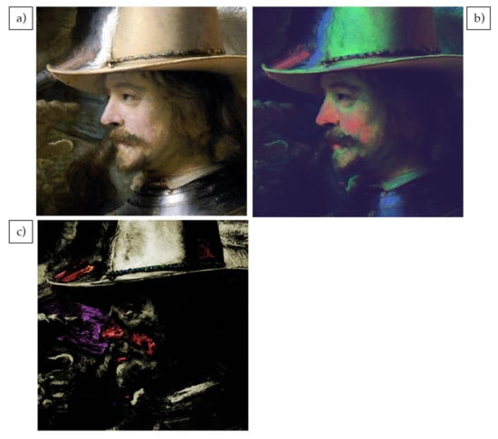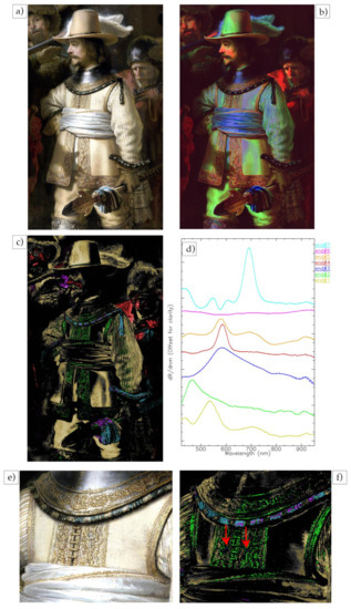 Rembrandt’s paintings are challenging for reflectance imaging spectroscopy, given their overall darkness and consequent low reflectance (<15%). Secondly, the intimate mixing of the pigments in the paints masks the spectral features associated with each individual pigments, as does the contribution of the light scattering from the pigments themselves. Thus, the 1st derivative of the VNIR reflectance image cube was used to emphasize the spectral features, to improve the identification and ultimately map the specific pigments. This advantage can already be seen in the false color made from VNIR’s first derivative image cube using 620 nm, 580 nm and 520 nm bands for the RGB channels (Figure 4b). The false color derivative image visually enhances the separation of pigments in comparison with the visible image. The false color immediately shows a clear difference between the color of the dark areas of the coat, which are bright green, the white sash, that has a blue tone, and some areas of the face, that are bright red. The inspection of the first derivative reflectance spectra shows that green is associated with a yellow ochre, blue with lead white and red with vermilion, although false color maps are not the best method to get an accurate distribution of the pigments.
