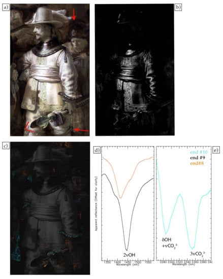Endmember #8 (end#8 in Figure 6d) shows an absorbance feature at about 1415 nm, which is in the region for the OH groups contained in clay minerals. The position of the OH overtone at 1415 nm and the absence of the characteristic triplets (1395, 1405 and 1415 nm) [21] confirms that the clay does not belong to the class of kaolin, and the best correlation is with a clay of the class of mica, specifically muscovite (Al2K2O6Si) [22]. This endmember maps to the medium brown-colored areas in the SAM map in Figure 6c. Clay minerals are commonly found in earth pigments, such as ochre, sienna or umber [23]. Earth pigments can be used as pigments in the paint layer or in a colored ground. A prior analysis showed that the ground of The Night Watch is a quartz ground, which also contains small quantities of earth pigments in addition to quartz and clay minerals [24]. In the area above Van Ruytenburch, the medium brown-colored areas seem to be associated with the ground layer (they also show the canvas structure) (Figure 6c). At the same time, in other areas, specifically on the tip of the spear, there is an accumulation of this clay, suggesting the use of earth pigments in the paint layer.