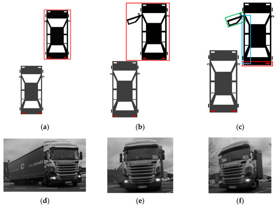 Potential application: (a–c): Facet-based representation used in automatic emergency braking situations (top view visualization). (a): The gray car detects the black car (red bounding box). (b): The gray car brakes to the rear of the black vehicle with the door open (if the car is detected as the red bounding box). (c): The gray car can perform a smoother braking if the black car is represented by its visible facets (each facet with a different color). (d–f): A large articulated vehicle cannot be modelled as an oriented cuboid during cornering maneuvers.