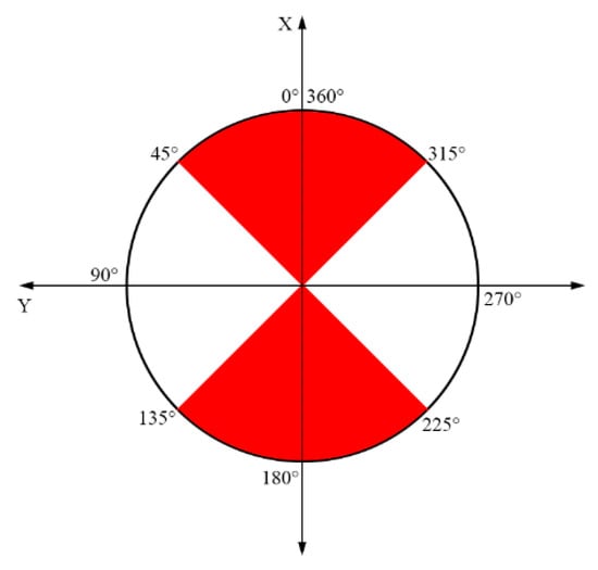 The reference system for LiDAR measurements has the following meaning for the axes: x—longitudinal/depth, y—lateral (towards the left), z—vertical. For each point, two coordinates are relevant for the next processing steps: the elevation and the distance to the sensor in the horizontal plane. The elevation is the vertical location of a point, given by the Z coordinate, and the distance or horizontal location depends on the region where the point is registered. Depending on the 3-D point channel orientation, the point can be considered predominantly in the front/rear of the sensor or on the left/right sides (Figure 3). For points placed in the front/rear, the X coordinate (larger than Y) is selected as the horizontal distance, while for the other points, the Y value is considered as the horizontal distance. These values will be used in the ground segmentation and in the clustering steps, in order to have a low computational complexity.