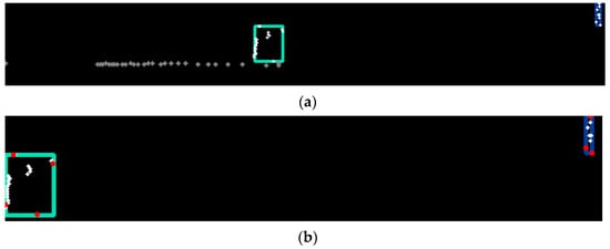 First, intra-channel analysis is performed to compute channel-level primitives of obstacles. In each channel, we determine the clusters of points (Figure 6a). For each cluster, the extreme points on each axis are selected (Figure 6b). These points provide the bounding boxes of the intra-channel clusters and are used further in object instance creation. After the initial channel clusters are determined, we look for close or overlapping clusters in the same channel and merge them. We consider that two clusters are close if the distance between them is smaller than the DISTANCE_BETWEEN_CLUSTERS value (=0.15 m).