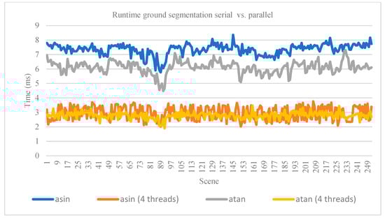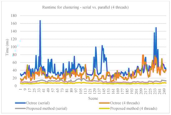 The implementation was done in C++, and OpenMP was used to parallelize the code on multiple cores. The system used for testing is equipped with an Intel Core i5-8300H CPU and 8GB RAM. The runtime for each part of the system was measured on sequential execution and also on parallel execution. For parallel execution, we used four threads, with appropriate implementations. All the runtimes are expressed for the entire 360° point cloud’s processing. All the runtimes presented are based on 252 scenes from [9]. For each scene, we performed 10 measurements and calculated the mean. The final average runtime of each processing step was calculated using the mean runtime from each scene.