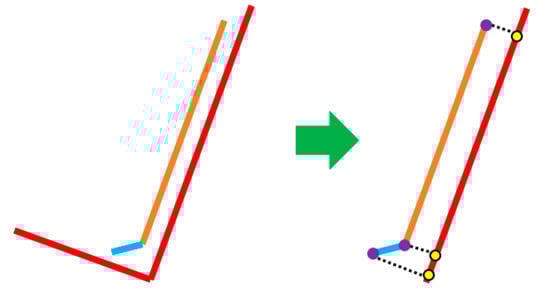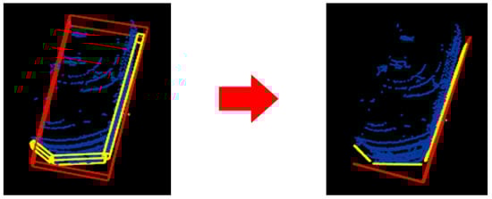 A facet can be assigned to two KITTI cuboid facets. The next step is to project the detected facet to the assigned one (Figure 16) and calculate an IoU score. Considering the score of each facet from the object, we calculate an average IoU score per object. A facet detected by our algorithm can have a different orientation from the corresponding KITTI facet. To compensate for this, we apply a penalty when computing the IoU score. In Equation (7), obj is the object, F is the number of facets from our algorithm, K is the number of extracted facets from the KITTI bounding box, inter is the intersection function, and θ is the angle between our facet and the corresponding extracted facet from the KITTI cuboid: