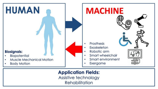 In the medical field, biosignal-based HMIs have increasingly been used for assistance and rehabilitation. An “assistive technology” is any system or object used to enhance, maintain, or improve the capabilities of a disabled individual and, more generally, any technology that allows accomplishing something that generally cannot be accomplished. “Rehabilitation” is defined as the physical restoration of a sick or disabled person by therapeutic measures and re-education to participate in everyday life activities within the limitations of the person’s physical disability [17]. People with severe disabilities enormously benefit from using these new HMIs for assistance and rehabilitation purposes. Clear examples are subjects with paraplegia or quadriplegia; those affected by neuromuscular disorders [5,18,19,20] such as Muscular Dystrophy (MD), Amyotrophic Lateral Sclerosis (ALS), or Multiple Sclerosis (MS); people with Spinal Cord Injury (SCI) or Cerebral Palsy (CP); or even stroke survivors and amputees. Literature reviews in these fields are currently limited to particular applications (e.g., prosthetic control, BCI, exergaming, etc.) or focused on specific biosignals. Table 1 provides a summary of some recent surveys regarding assistive and rehabilitative HMIs. As an example, Mohebbi et al. [21] proposed a review about human–robot interaction in assistive and rehabilitation robotics, while Frisoli et al. [22] focused on wearable technologies and, in particular, on a robotic exoskeleton for assistance in performing activities of daily living (ADL). Baniqued et al. [7] presented a review study on BCI robotics for motor rehabilitation of hand movements after stroke. Different surveys such as [9,10,23,24,25,26,27,28] focused specifically on the state-of-the-art and control strategies of upper limb prostheses, while further reviews presented exergaming applications for rehabilitation neuromotor functions [29,30,31,32].