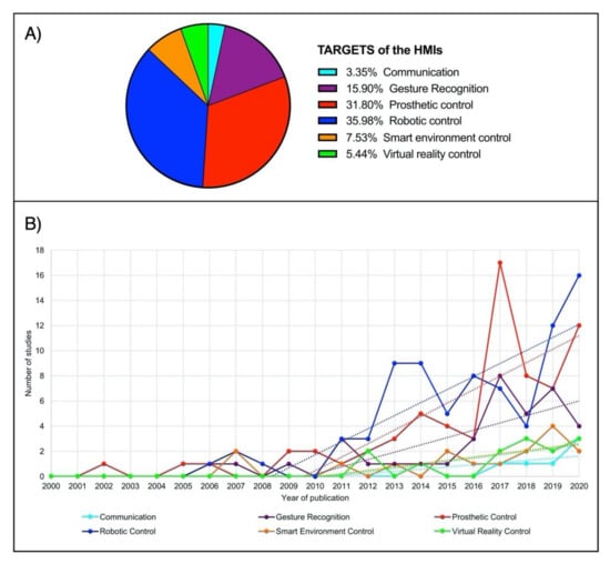Many HMIs are based on the acquisition of the EEG signal, mostly of noninvasive type. Specifically, these technologies are referred to as Brain–Machine Interfaces (BMIs) or Brain–Computer Interfaces (BCIs), since they provide an alternative interaction pathway with the surrounding environment by capturing brain waves and translating them into control signals or commands for an external device [62]. Generally, after a preprocessing phase, some meaningful features are extracted from the acquired EEG signals, and then a classification step is performed to interpret human intention. Afterward, each class is associated with a specific command. In this context, the user is often required to focus on a cognitive task (e.g., motor imagery), or an external stimulation (e.g., visual, auditory, somatosensory) is provided to induce a brain response. The resultant EEG signals are Event-Related Potentials (ERPs), the most commonly used brain waves in a BMI/BCI system [63]. For this reason, in recent years, EEG-based HMIs have found strong application in the assistance and rehabilitation field. Indeed, they represent a powerful tool for people with severe motor disabilities, who need to assist or restore their muscle function or even replace a missing limb, thus improving their quality of life. Clear examples are subjects affected by neuromuscular disorders, such as MD, ALS, MS, SCI, and CP, or even poststroke patients and amputees [5,18,19,20]. In this scenario, two main targets can be identified: robotic control [14,15,34,49,50,64,65,66,67,68,69] and prosthetic control [46,47,48,69,70,71,72,73,74,75,76,77,78].