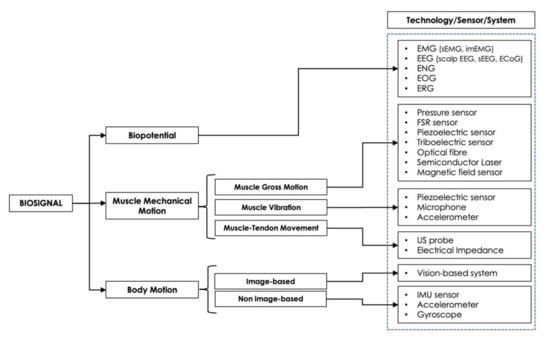 Four macrocategories were considered to classify the biosignals used as a control for HMIs: (1) biopotential (EMG, EEG, etc.), (2) muscle mechanical motion (gross muscle motion, muscle vibrations, muscle–tendons movements), (3) body motion (limb or joint motion, hand gesture, eye movements), and (4) hybrid (a combination of two or more different biosignals).