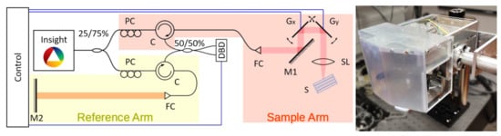 As shown in Figure 1, the light is split into reference (25%) and sample arm (75%) by a fiber coupler and is released into free-space by 4 fiber collimators. The sample arm (red) features a rotatable imaging probe with conjugated scanning and an LSM54-1310 scan lens (Thorlabs, Newton, NJ, USA) for a flat imaging plane. In the reference arm (yellow), the light is reflected by a mobile mirror. Circulators guide the reference and sample arm signal to a 50/50% fiber coupler for recombination. A dual-balance-detector (BPD-1, Insight Photonic Solutions, Lafayette, LA, USA), short DBD, records the cross-correlation term and an ATS9360 data acquisition card from Alazar Technologies, Canada, is used to digitize it. To prevent the saturation of the detector, an adjustable neutral density filter is used in the reference arm. The system achieves an axial resolution of 31 and a lateral resolution of 24 in air as well as a SNR of 105 dB. To ensure satisfactory oversampling, a lateral pixelsize of in air is selected.