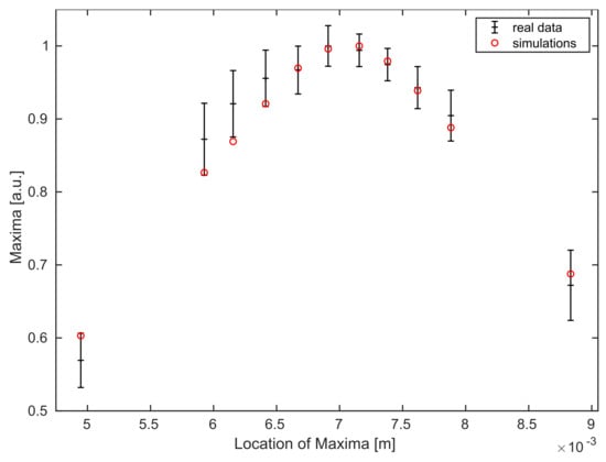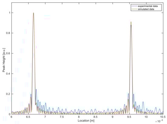 For a better visualization, in Figure 10, a direct comparison between experimental data and the simulations (using recalibrated system parameters) for a single A-scan is provided. In order to obtain a reasonable comparison, both experimental and simulated datasets are normalized to one.