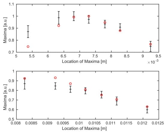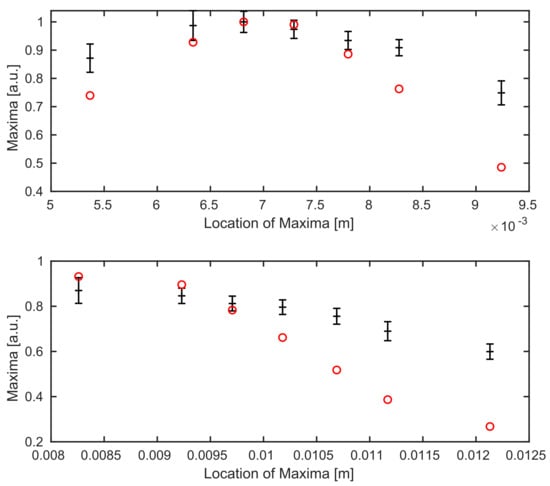 Comparison between averaged maximum values of the experimental data (black) and simulations (red) for different position through the focus after the recalibration of values and . Top: we see the top surface, bottom: the background surface of the underlying coverglass.