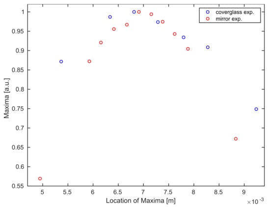 For quantification of the Gaussian behavior of the focus, a motorized stage (T-LSM050A, Zaber Technologies, Vancouver, BC, Canada) was used to transport once a mirror and once a microscopy coverglass through the focus of the OCT system, with a roughly fixed tilt of about . The coverglass (631-0124, VWR International, Radnor, PA, USA) has a refractive index of for 1300 , which needs to be taken into account during data analysis. At each position of the stage, we use 11 steps for the mirror and 7 for the coverglass, a 3D OCT volume was recorded. These 3D volumes were post-processed according to Section 2.1 and used to determine the exact incident angle and the distance of the center of the sample surface to the position where sample and reference arm would have the same length, called zero delay.