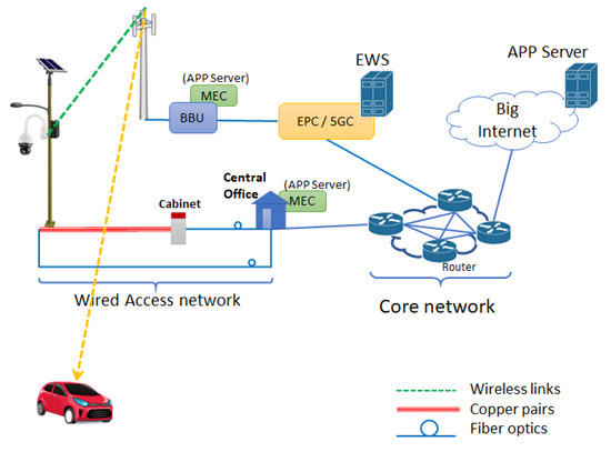 - Path E: it refers to a variation of the communication Architecture 3; images are processed in the MEC located in the CO (i.e., in the wired access network). In this case, is:The is the time interval required to send back the alarm through the wired access network, before the Wi-Fi access point.