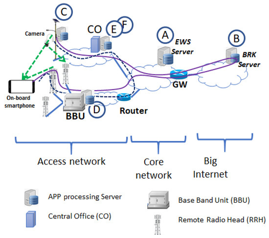 - Path F: it refers to Architecture 2; the processing server is located in the MEC inside the CO. Alarms are sent to the intended driver through the eNBs of the wireless access network. In this case, the is:Even in this case, eNB downlink data channels are used to send the alarm.