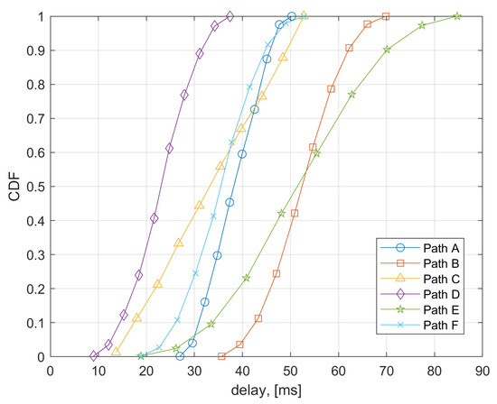 In Table 1 we have detailed the minimum and maximum latencies, expected for each component of the considered communication path. Data were taken from [21,22]. Note that for Architecture 1 (path A) and Architecture 2 (path B, path D, path F) we have considered 4G-LTE in the air interface time (i.e., the worst case). Further latency reduction occurs when 5G is available as access technology, giving a of about 1 ms or even below when self-contained frames and short time transmission intervals are used (e.g., for 60 kHz and 120 kHz carrier spacing), instead of 3–18 ms typical of LTE Release 8.
