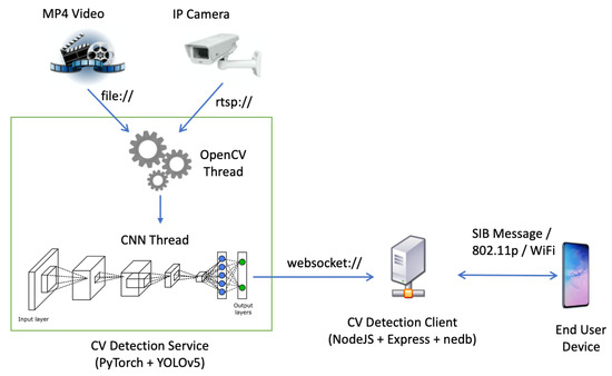 The single PD with camera generates the alerts, which are broadcast to the apps in the vehicles using a local radio transmission technology such as WiFi (or the IEEE 802.11p for equipped vehicles). For this arrangement to properly work, it is necessary the close interaction between the PD and the vehicle’s app as indicated in Figure 6. In particular, the main functionalities to be implemented in the PD and in the vehicle’s app are detailed in the following points.