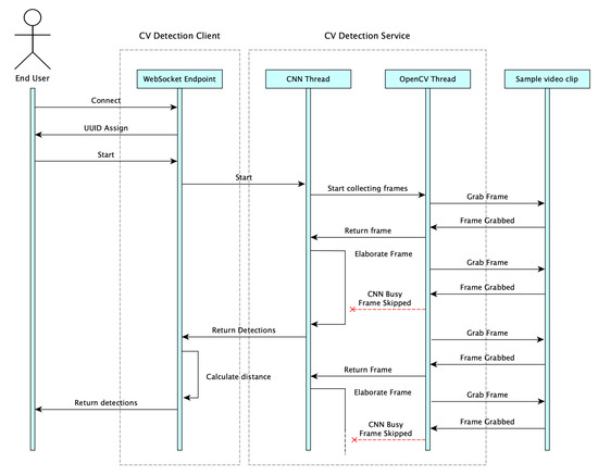 where is given in accordance with the communication path in Section 5 and is the processing time that can be easily evaluated taking into account for the behavior of the proposed PD system detailed in the activity diagram in Figure 11. In particular, the is proportional to the inverse of the rate of processed frames which can be lower or equal to the video frame rate depending on the available computational power in the PD.