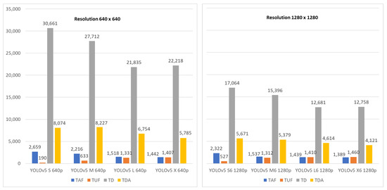 Experiments were conducted considering variable fps depending on the image resolution and the model size. We obtained , , , and fps for YOLO v5 S, M, L, and X respectively, while , , , and fps for YOLO v5 S6, M6, L6, and X6. Results concerning the performance figures in the previous points are shown in Figure 13.